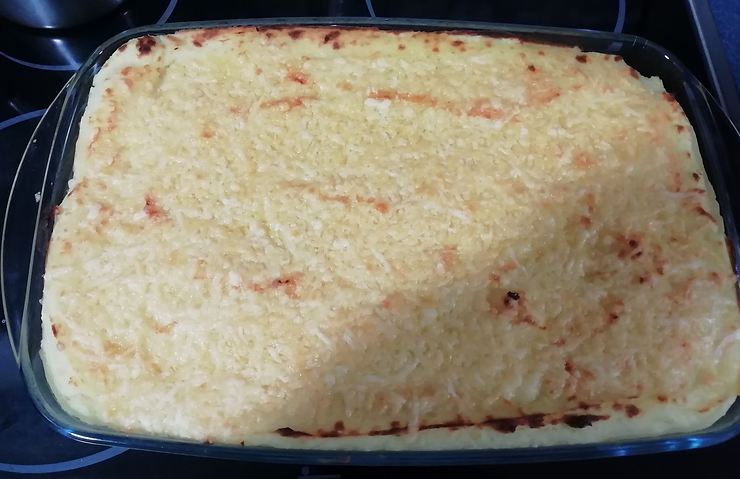 Le ponemos queso rallado por encima y metemos al horno que previamente habremos calentado a 180 grados con calor arriba y abajo, lo tendremos unos 25/30 minutos, controlando el dorado del queso.